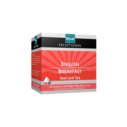 A bright morning tea, with body, strength, colour and pungency representing the essence of fine Ceylon tea. The beautifully even Broken Orange Pekoe leaf yields a burgundy coloured brew which is robust and strong yet bright with a bold personality. Dilmah Exceptional English Breakfast contains 20 luxury (pyramid) leaf tea bags in an airtight foil pouch, protecting taste and flavour.